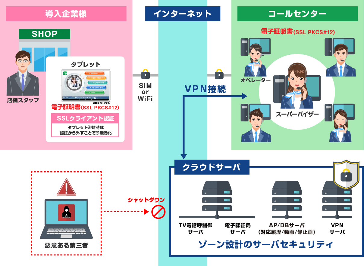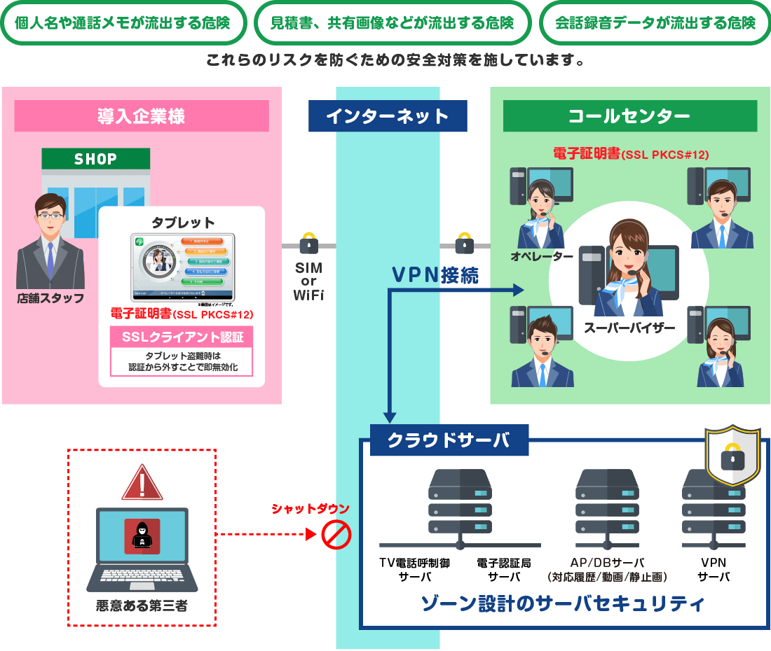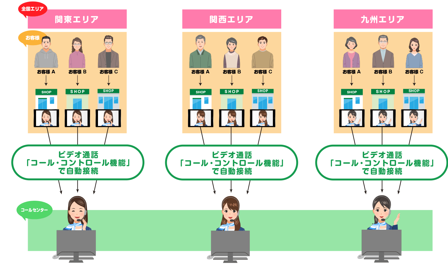 コールセンターの連動により各種ショップやイベント会場、窓口業務などに最適なリモート型コンタクトツールとして開発。